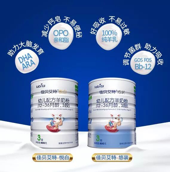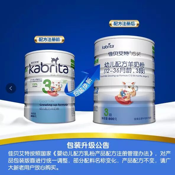 “为了保障婴幼儿健康,佳贝艾特在响应史上最严的‘奶粉新政’这项工作上丝毫不敢怠慢,旗下婴幼儿配方羊奶粉佳贝艾特·悦白和佳贝艾特·悠装早早成功通过了国家食品药品监督管理总局的婴幼儿配方奶粉注册,并顺利生产和销售。”佳贝艾特方面表示,现在,根据相关法规,佳贝艾特在名称和外包装上进行了更改。