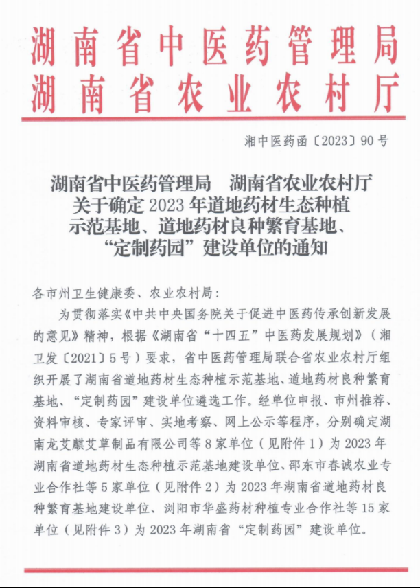 为贯彻落实《中共中央国务院关于促进中医药传承创新发展的意见》精神,根据《湖南省“十四五”中医药发展规划》(湘卫发【2021】5号)文件要求,省中医药管理局联合省农业农村厅组织开展了湖南省到底药材生态种植示范基地、道地药材繁育基地、定制药园建设单位遴选工作。经过资料审核、专家审评、实地考察、网上公示等程序,分别确定......安化县为“湘·黄精”道地药材良种繁育基地建设单位。中源农业建设的安化多花黄精种苗中心将在省中医药管理局、省农业农村厅的支持下,将建设为“湘黄精”良种繁育基地。