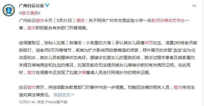 广州白云警方6月1日通报:关于刘某(微博名:小岛里的大海)故意编造谎言引发社会广泛关注一事,经警方进一步调查核实,查明刘某故意编造虚假信息,通过注册微博、微信账号方式冒用其他家长身份恶意散布传播,并雇请人员进行网络炒作,从而达到迫使学校开除涉事老师、索要赔偿等目的。