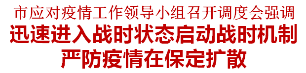 会议指出,保定毗邻北京,货运往来、人员往来十分密切,这就要求我们必须高度警觉,立即行动,本着“人民群众安全和身体健康至上”的原则,坚决杜绝任何侥幸心理,不等不靠、立即行动,严防死守、精准施治、有效管控,慎之又慎、严之又严地把好各个关口,严防疫情在保定扩散。